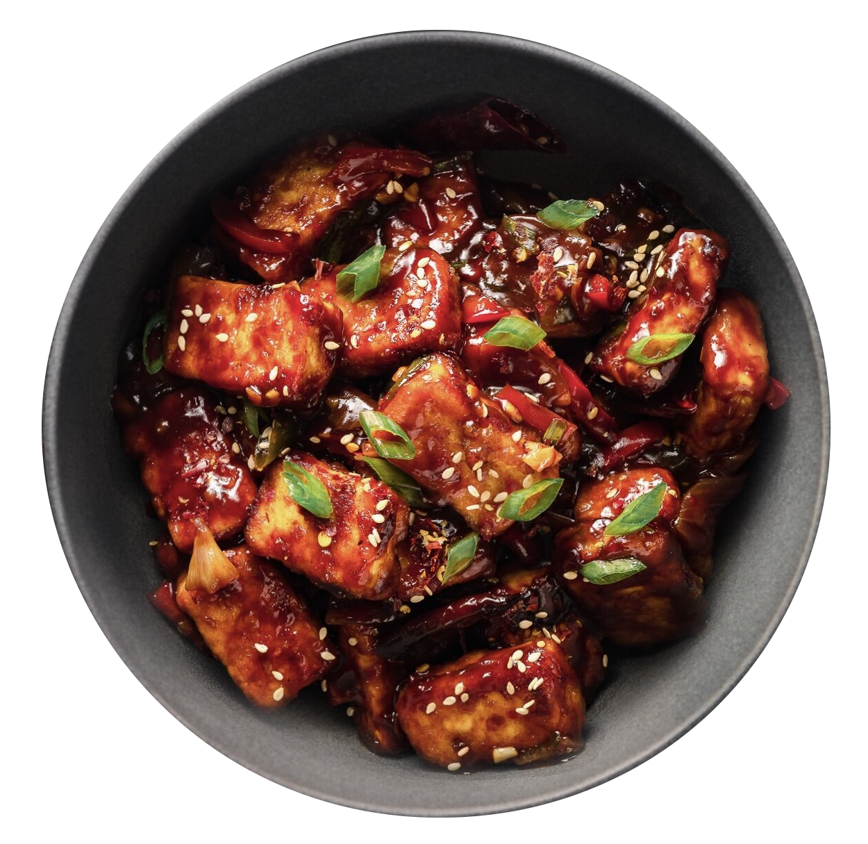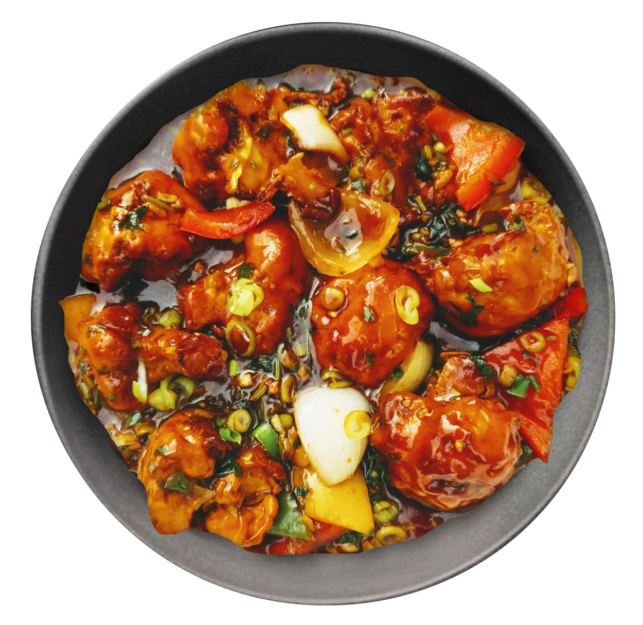 (Coated cottage cheese, peppers and onions stir fried in soy and ginger sauce)