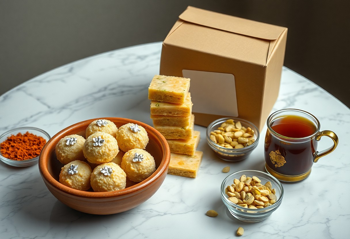 Choose a mix of textures and flavors when assembling a gift box so you can delight every palate; include classic ladoos, creamy barfis, a nutty mithai, and a sugar-free option, then balance colors and shelf lives for safe shipping.